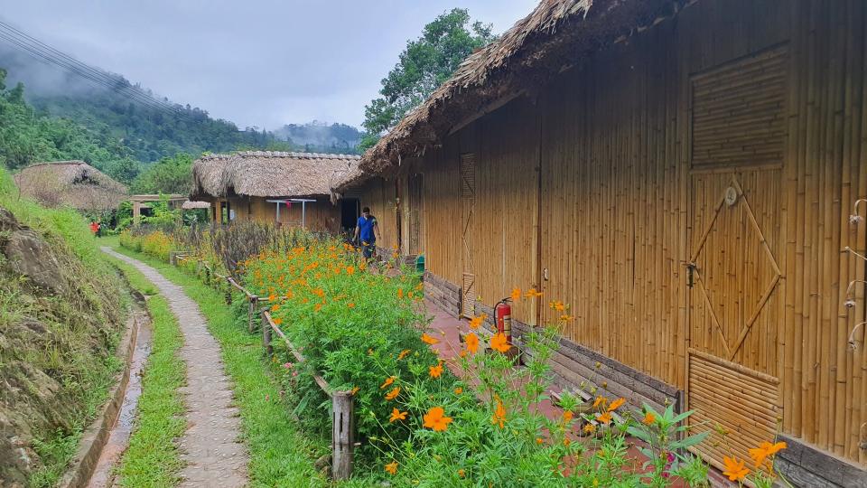 Khách sạn của chúng tôi nằm trên ngọn núi cao ở thôn Nậm Hồng, xã Thông Nguyên, cách trung tâm huyện Hoàng Su Phì khoảng 40km. Đường đến đây phải đi qua nhiều khúc cua cùi chỏ đến thót tim, bác tài là người chuyên đi những cung Tây Bắc nên mới dám đi. Ngày đoàn chúng tôi đi, đầu tháng 10, trời mưa tầm tã, khiến đoạn đường bị sạt nghiêm trọng. Khách sạn phải kêu xe ôm xuống chở từng người trong đoàn lên.