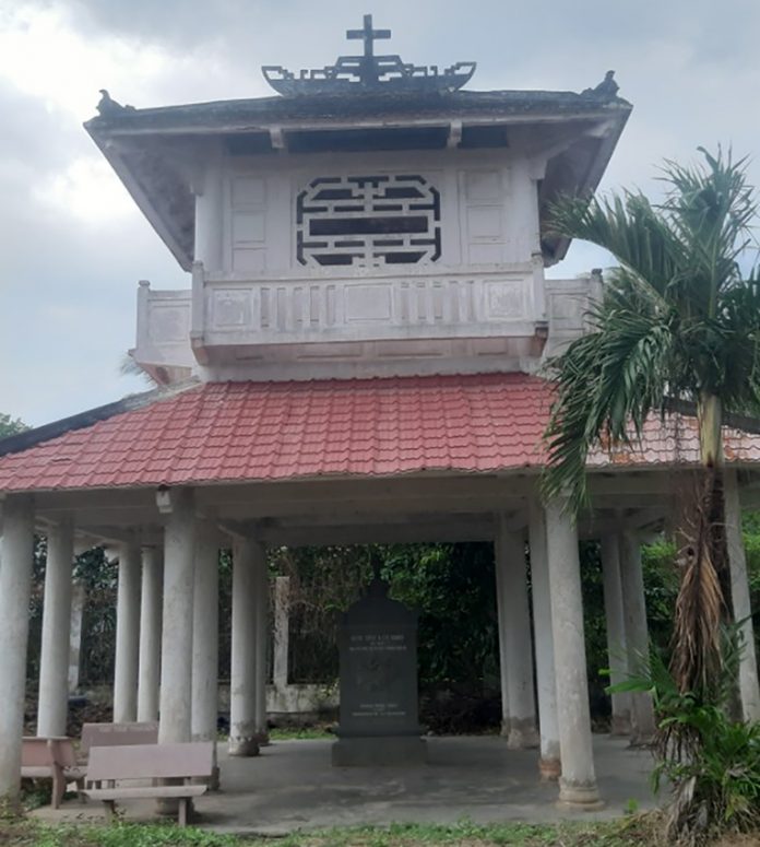 Nhà bia có 4 mặt, không có vách, với 16 cột tròn bằng xi măng, mái lợp ngói. Bên trong có bia được làm bằng đá xanh, cao khoảng 2,5m, được điêu khắc khá công phu với sự phối hợp Đông- Tây: Phía trên hình tượng lưỡng long tranh châu là hình tượng Thánh giá. Mặt trước, quay ra hướng rạch Ông Mầu, bia được khắc bằng 3 ngôn ngữ là tiếng Pháp, chữ Hán và tiếng Việt.