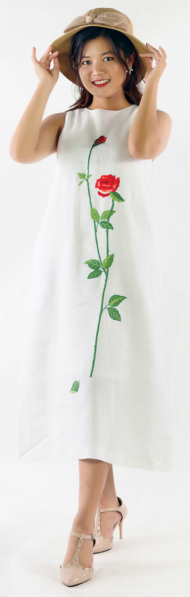 Để bù đắp lại tính đơn điệu trong phom (form) dáng, các mẫu váy chú trọng vào sự tinh tế của những mẫu thêu tay. Lấy cảm hứng từ những cánh hoa nhẹ nhàng, tinh tế, những đường thêu cầu kỳ tạo nên điểm nhấn bắt mắt trên chiếc váy. Ngoài ra, việc thêu tay cũng làm cho tổng thể chiếc váy trở nên dịu dàng và nữ tính hơn. Công sức bỏ ra cho mỗi chiếc váy là không hề nhỏ, có hình thêu có thể tốn đến vài tháng để hoàn thành.