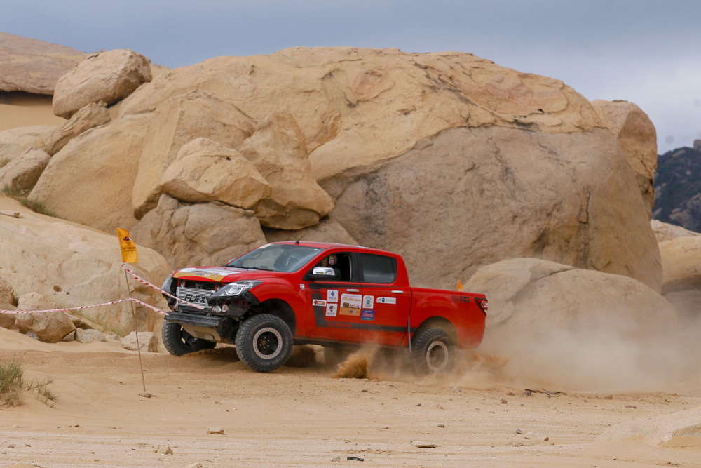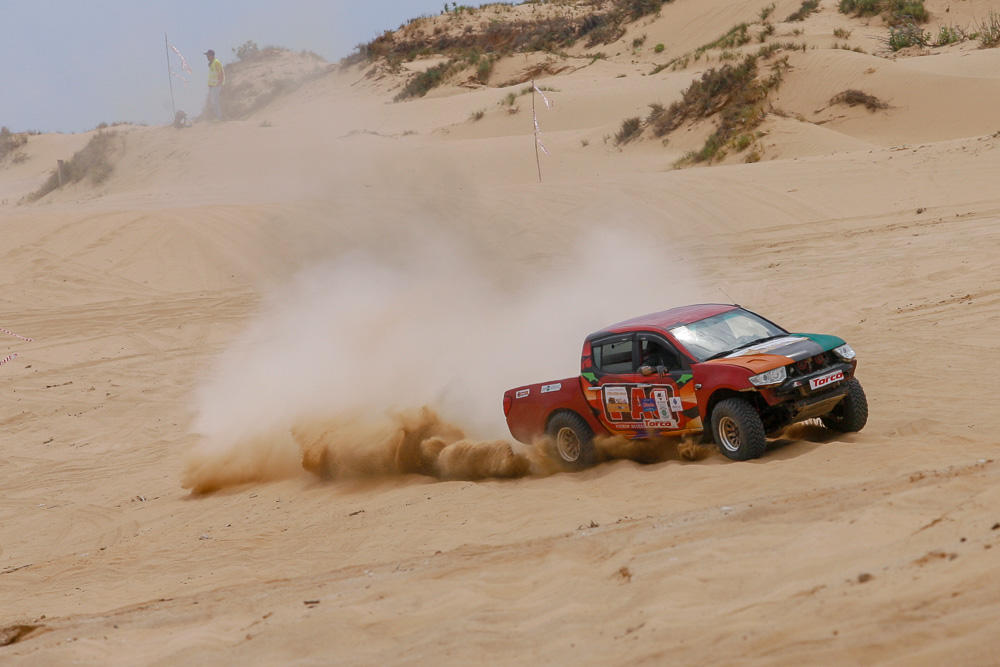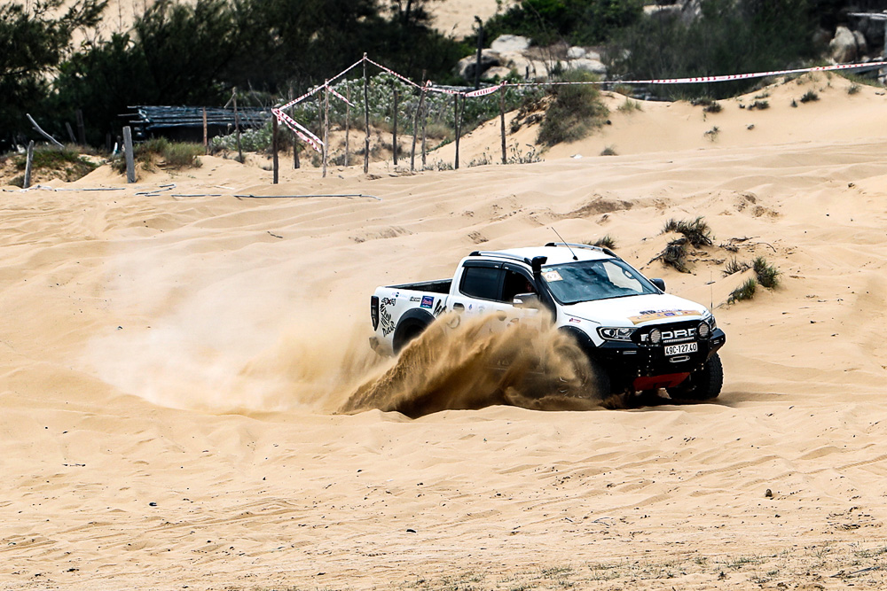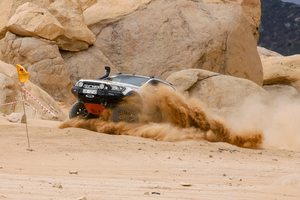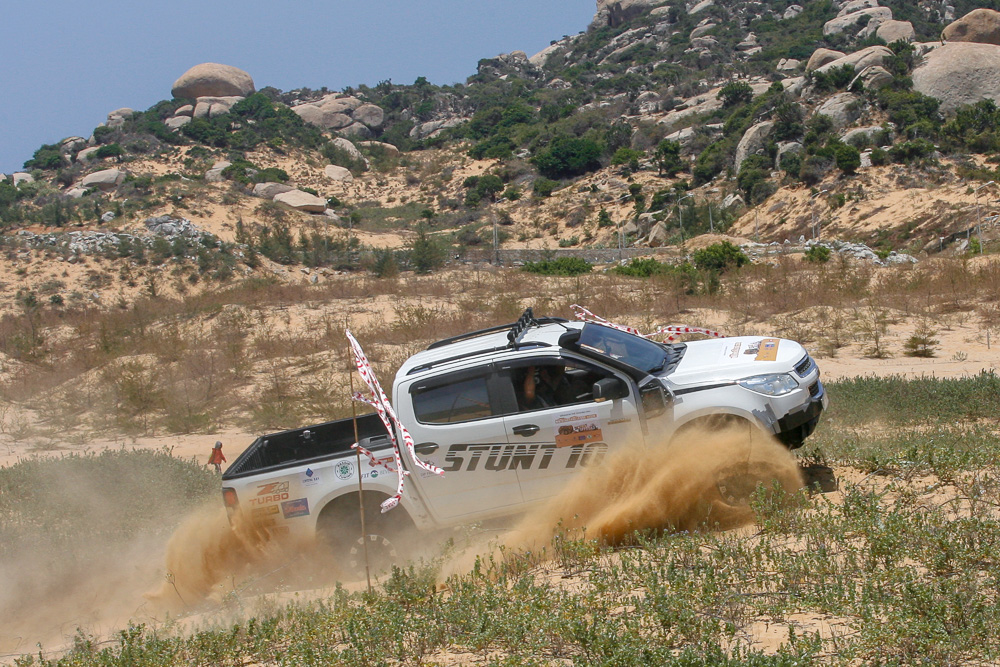 Trong một không gian rộng lớn và địa hình sa mạc kề biển rất độc đáo của khu du lịch Mũi Dinh, hai phân hạng thi đấu Pick Up và SUV lần lượt khởi tranh vào sáng 29-4 vừa qua. Ở phân hạng Pick-Up gồm 22 đội và SUV gồm 12 đội lần lượt chinh phục sáu cung đường thi.