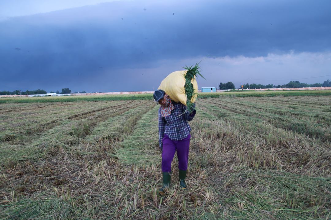 Giữa cánh đồng thấp thoáng bóng những cô bác nông dân thu hoạch lúa bên cạnh chiếc máy gặt thoắt chạy thoắt dừng để “nhả” những hạt lúa vào mấy chiếc bao căng đầy. Trong khi chờ đợi máy gặt tiếp tục ngang dọc mấy ô ruộng, cô nông dân thoăn thoắt tranh thủ gom nhặt những hạt lúa rơi vải trên đất.