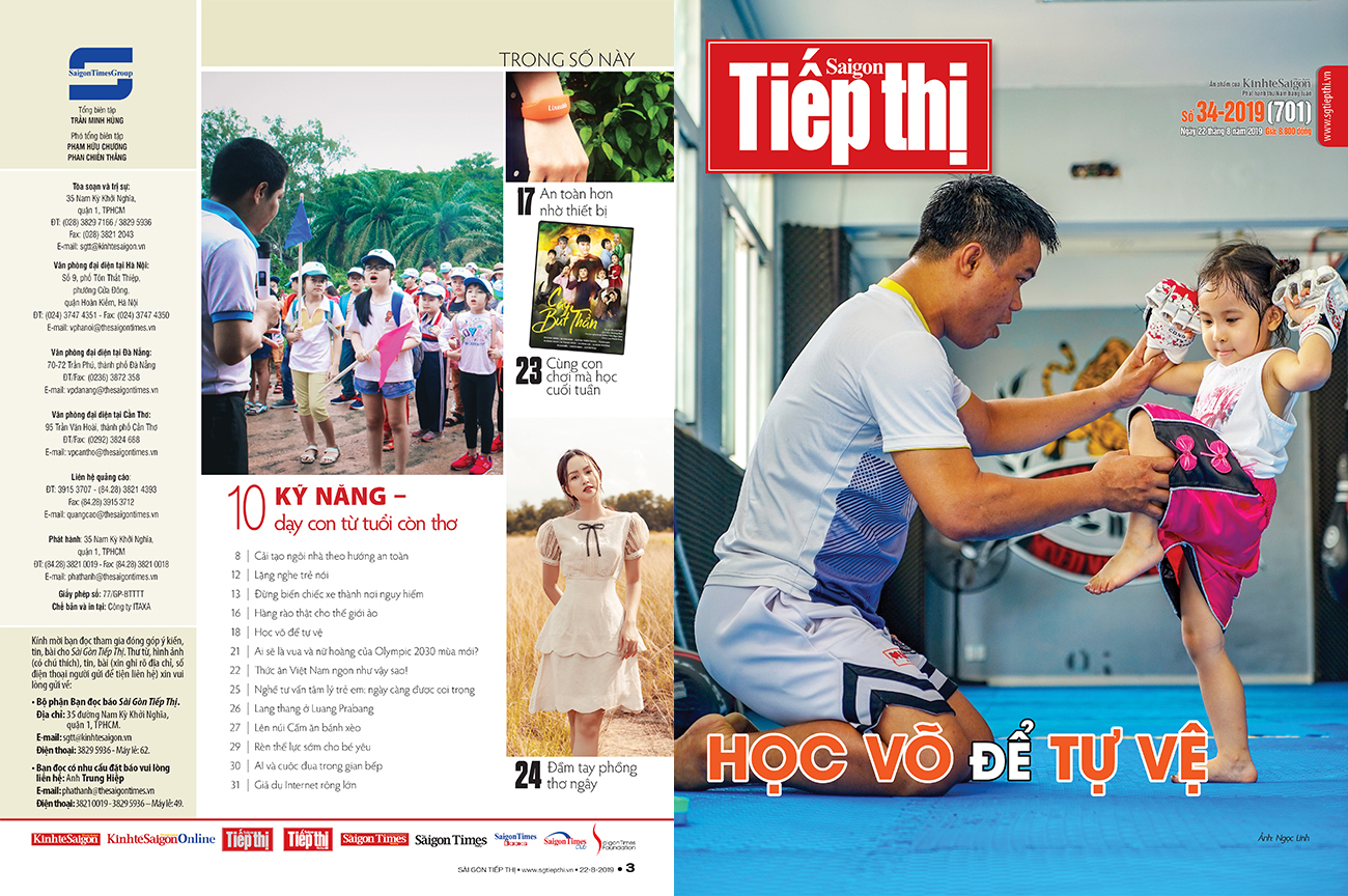 Sài Gòn Tiếp Thị số 34, ra ngày 22-8-2019 giới thiệu cùng các bậc phụ huynh những lớp học võ phù hợp với các bé, cũng như chia sẻ nhiều thông tin hữu ích xoay quanh việc bảo vệ an toàn cho trẻ khi không có ba mẹ kề bên.
