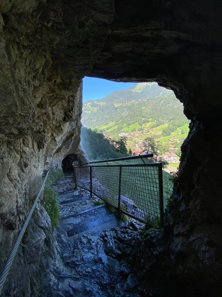 Từ chân thác Staubbach, du khách có thể men theo lối cầu thang nhỏ lên núi để được đứng phía sau ngọn thác và ngắm nhìn một góc ngôi làng qua làn nước mát lạnh.
