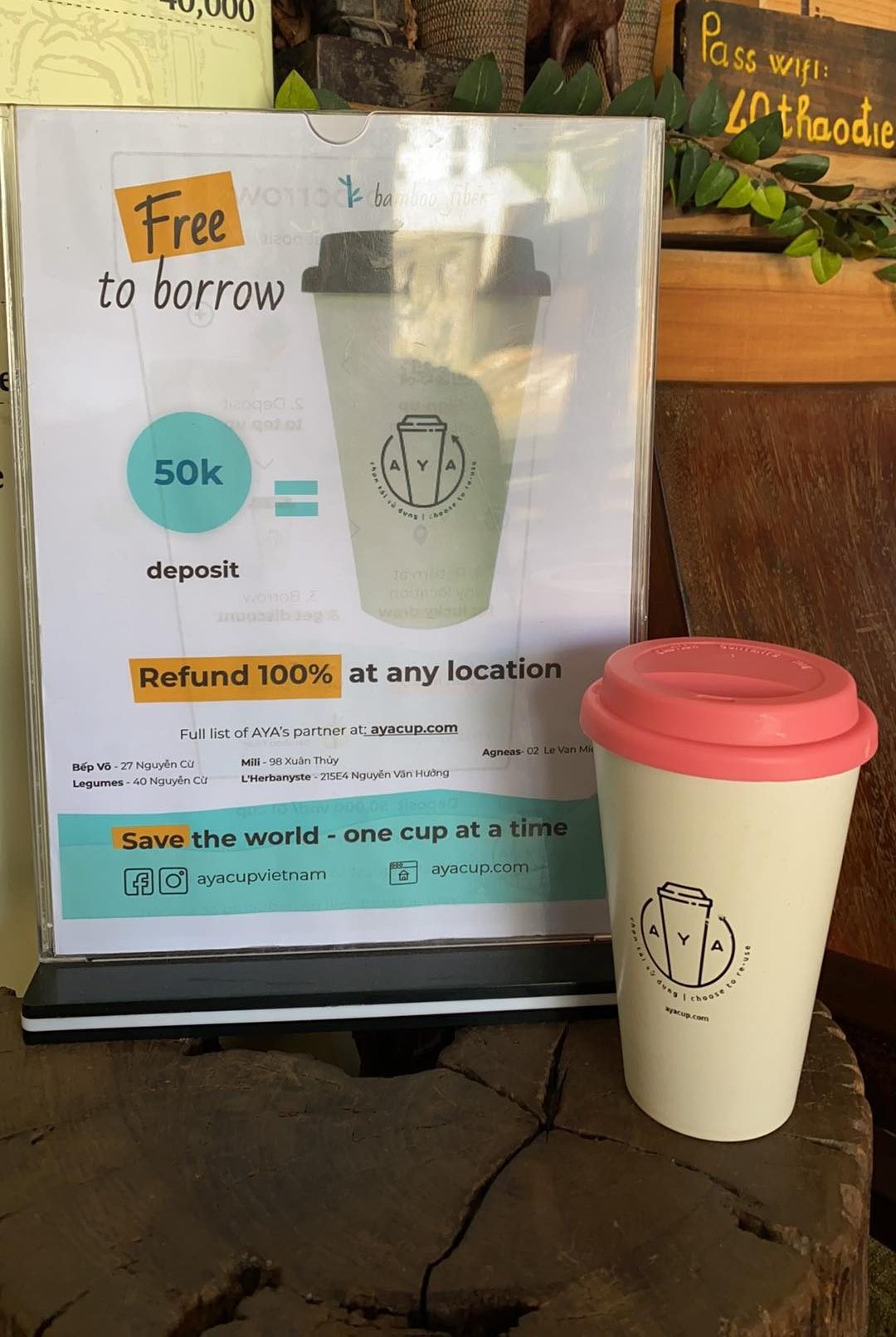 Dự án AYA Cup nhắm đến mô hình mượn – trả ly cho đồ uống mang đi nhằm giảm bớt lượng rác thải nhựa. Người dùng sẽ đặt cọc 50.000 đồng cho một chiếc ly tại các địa điểm có dịch vụ của AYA Cup. Người dùng thoải mái sử dụng ly, có thể hoàn trả tại bất kỳ địa điểm có dịch vụ này và lấy lại khoản tiền cọc ban đầu. Việc làm này vừa giúp giảm thiểu lượng rác thải nhựa ra môi trường vừa giúp các đơn vị tham gia dự án tiết kiệm được chi phí về bao bì đóng gói mang đi. AYA Cup sẽ thu một khoản phí hàng tháng từ các đơn vị này, xấp xỉ 20.000 đồng/ngày, giúp họ tiết kiệm 84% chi phí.